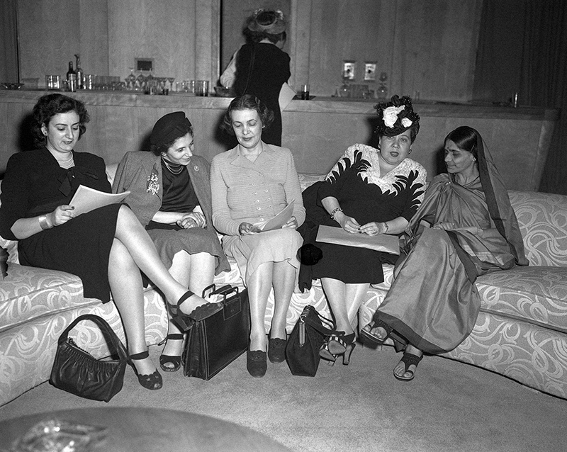 En 1946, el Consejo Económico y Social de la ONU creó la Comisión de la Condición Jurídica y Social de la Mujer, cuya función era recabar información y hacer recomendaciones para promover los derechos de las mujeres en las áreas educativa, económica, política y social. En la imagen aparecen Angela Jurdak (Líbano), Fryderyka Kalinowski (Polonia), Bodil Begtrup (Dinamarca), Minerva Bernardino (República Dominicana) y Hansa Mehta (India), quienes fueron delegadas de la Comisión.
