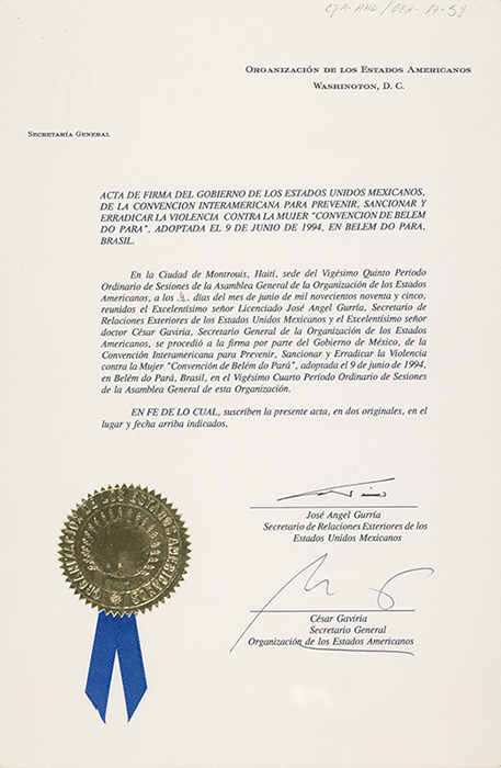 Acta de firma de México de la Convención Interamericana para Prevenir, Sancionar y Erradicar la Violencia contra la Mujer (Convención de Belém do Pará) en 1994, primer tratado internacional jurídicamente vinculante que aborda de forma específica la violencia contra las mujeres.