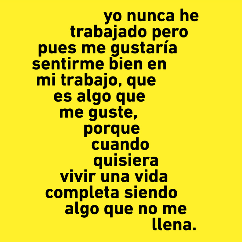 “La ciudad del trabajo” aborda el empleo en el neoliberalismo y propone una reflexión sobre movilidad, precariedad y flexibilidad laboral. En el ámbito de los servicios, los empleados se ven obligados a reprimir sus sentimientos para satisfacer las expectativas de los clientes. A estas manifestaciones ligadas a la interacción humana, Arlie Hochschild las denomina “trabajo emocional”. El mandato de buena atención exige contención, labia y sonrisa: una performatividad que conduce a la racionalización de las emociones en un contexto donde, según Franco Berardi, la felicidad se ha vuelto un imperativo ideológico. Conocimos a jóvenes que estudian y trabajan en empresas de servicios; conversamos con ellos sobre el panorama actual del empleo y les pedimos sonreír durante un minuto frente a la cámara. Esta solicitud, en apariencia sencilla, genera un retrato paradójico de nuestro tiempo.